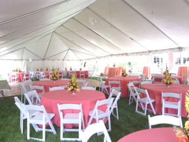 Pole tents are just what they are called.... they have poles in the center. The Pole tent requires anchoring into the surface 10’ beyond the exterior with ropes and stakes. Pole tents use tension straps to create a smooth appearance. Pole tents can have beautiful high peaks and present a lot of curves. Price includes installation!